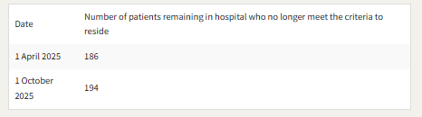 The following table shows how many beds at University Hospitals Dorset were occupied by patients with no criteria to reside for 1 April 2025 and 1 October 2025:
